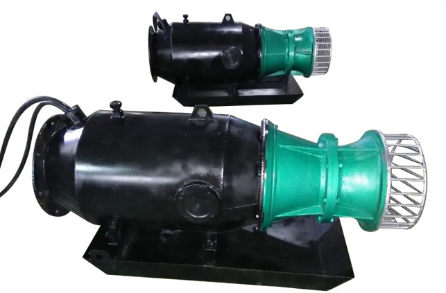 QZB型潛水軸流泵和QH(B)型潛水混流泵,泵段由進水喇叭口,葉輪部件,葉輪外殼和導葉體四大零件組成。潛水電機是全密封干式異步電動機,機殼將電機封閉,電機上端電纜出線處有靜密封裝置,電機下端蓋出軸處有轉動密封裝置,潛水電機具備一切潛水運行的安全可靠性能。對密封滲漏、線圈和軸承溫升均有監測、報警和保護裝置,不影響電機正常運轉的早期滲漏(只報警)。當線圈溫度超過135℃、軸承溫度超過90℃時,采用斷電保護,所有保護器由一個潛水泵專用保護器進行監控,以保證潛水泵安全使用。