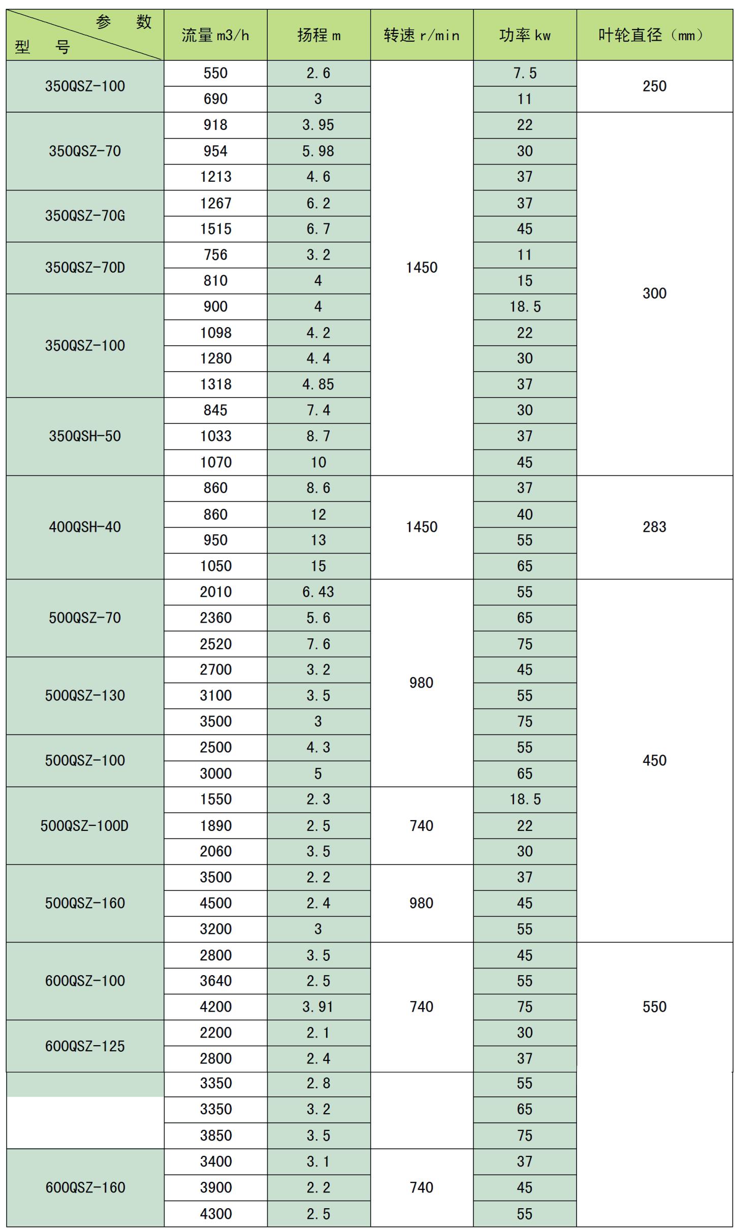 本公司潛水泵名義出水口徑從350、500、600、700、800、900、1000、1200、1400、1600共計十種口徑,流量范圍0.12-12m3/s,揚程范圍2-14m;功率范圍7.5-630kW;電壓等級380V、660V、3kV、6kV 、10kV。